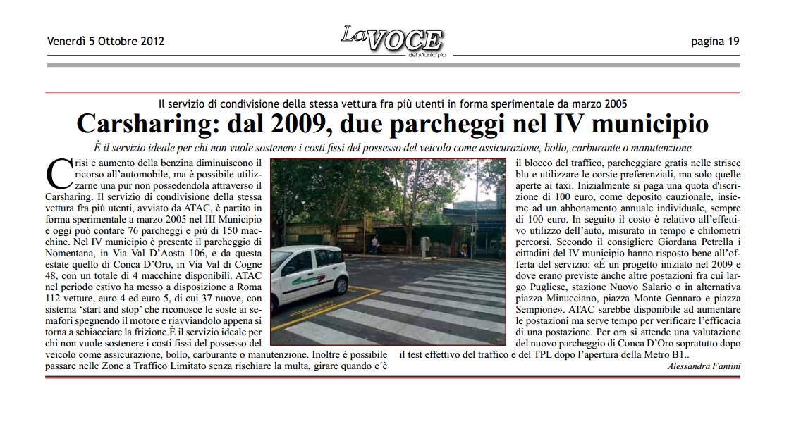 Il servizio di condivisione della stessa vettura fra più utenti, avviato da ATAC, è partito in forma sperimentale a marzo 2005 nel III Municipio e oggi può contare 76 parcheggi e più di 150 macchine. Nel IV municipio è presente il parcheggio di Nomentana, in Via Val D’Aosta 106, e da questa estate quello di Conca D’Oro, in Via Val di Cogne 48, con un totale di 4 macchine disponibili.