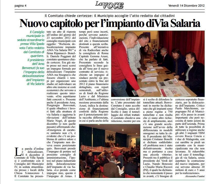 Il Comitato ha presentato un atto di risposta all’ordine del giorno del 23 novembre 2012 del consiglio municipale con oggetto: “Richiesta delocalizzazione impianto AMA Via Salaria 981” a firma Ripanucci- Bonelli.